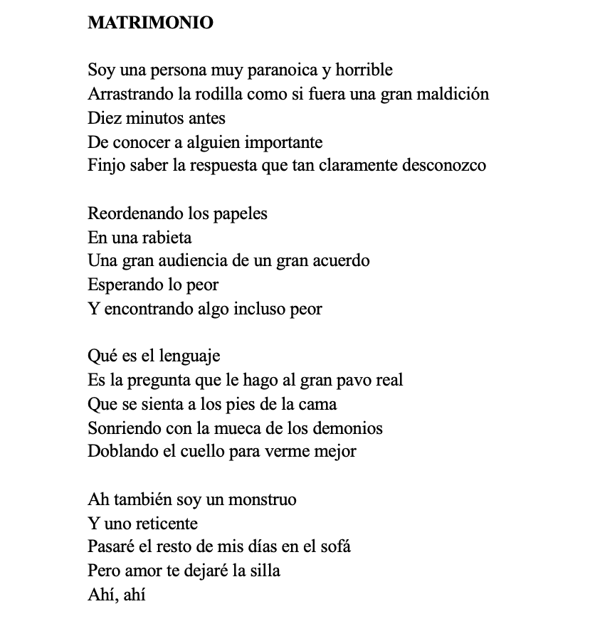 Te dejo con un intento de traducción de Marriage, uno de los poemas que aparecen en The Shining de Dorothea Lasky. Espero que te guste: