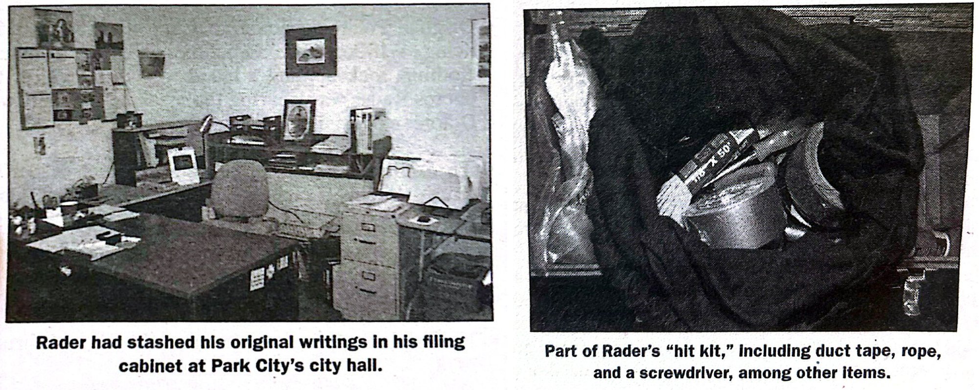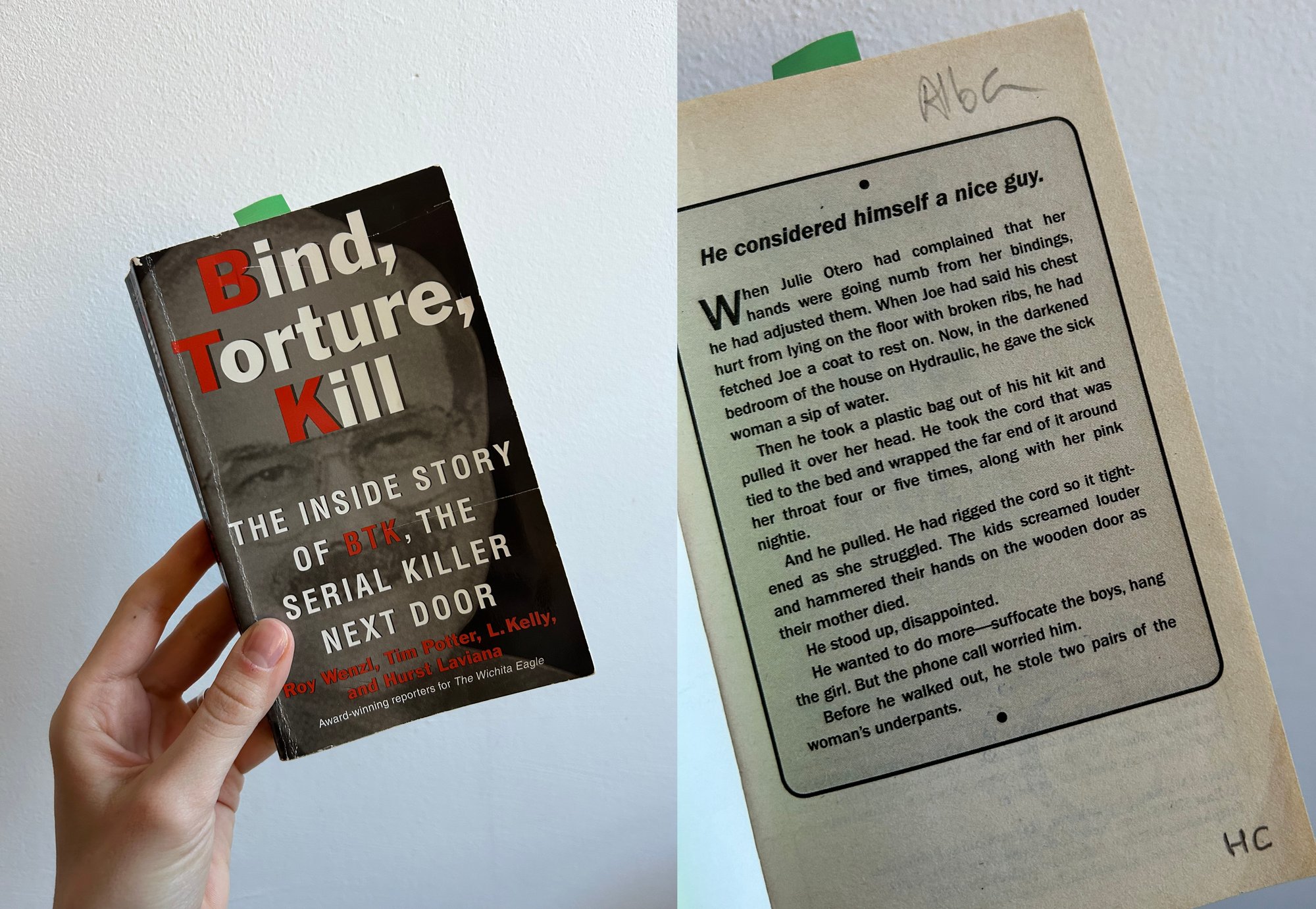 Continué mirando el resto de libros y ninguno de ellos estaba anotado o con marcadores,1 pero me hizo gracia ver que, en esos repasos rápidos, siempre me detenía en alguna página o recorte de prensa escaneado que hablaba de la doble vida de los asesinos en serie. En el caso de Rader, compaginaba su faceta de asesino con su trabajo en el ayuntamiento de Park City (Kansas) y ayudando en la iglesia del pueblo (le pillaron después de 30 años porque envió un disquete a la policía que contenía metadatos del ordenador de la iglesia).