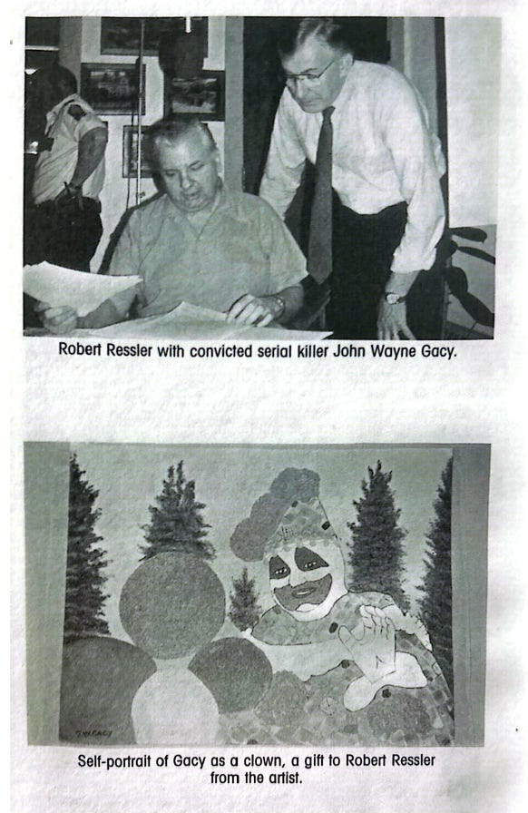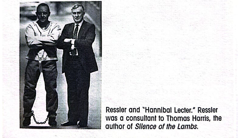Otro libro que tengo es el de Robert K. Ressler, un tipo que fue agente del FBI durante veinte años y supervisor de la Unidad de Ciencias de la Conducta (se basaron en él para crear a uno de los personajes de la serie de David Fincher Mindhunter, RIP you’ll always be missed). El libro en cuestión se llama, traduzco literal, «He vivido dentro del monstruo» y en él aparece una foto suya de fan total con John Wayne Gacy y esta frase promocional que traduzco también: «Ressler conoce mejor que nadie la mente de un asesino.» Me gusta pensar que Thomas Harris –autor de El silencio de los corderos y al que Ressler asesoró para sus novelas–, se basó en el propio Ressler para crear al personaje de Will Graham, un policía que lucha a diario por tener una vida normal y no despertar ese instinto asesino que sabe que tiene (imagino que en la saga también es así, aunque no he leído ninguno de los libros y escribo pensando en las adaptaciones que ha tenido, especialmente en Manhunter de Michael Mann, mi peli favorita).