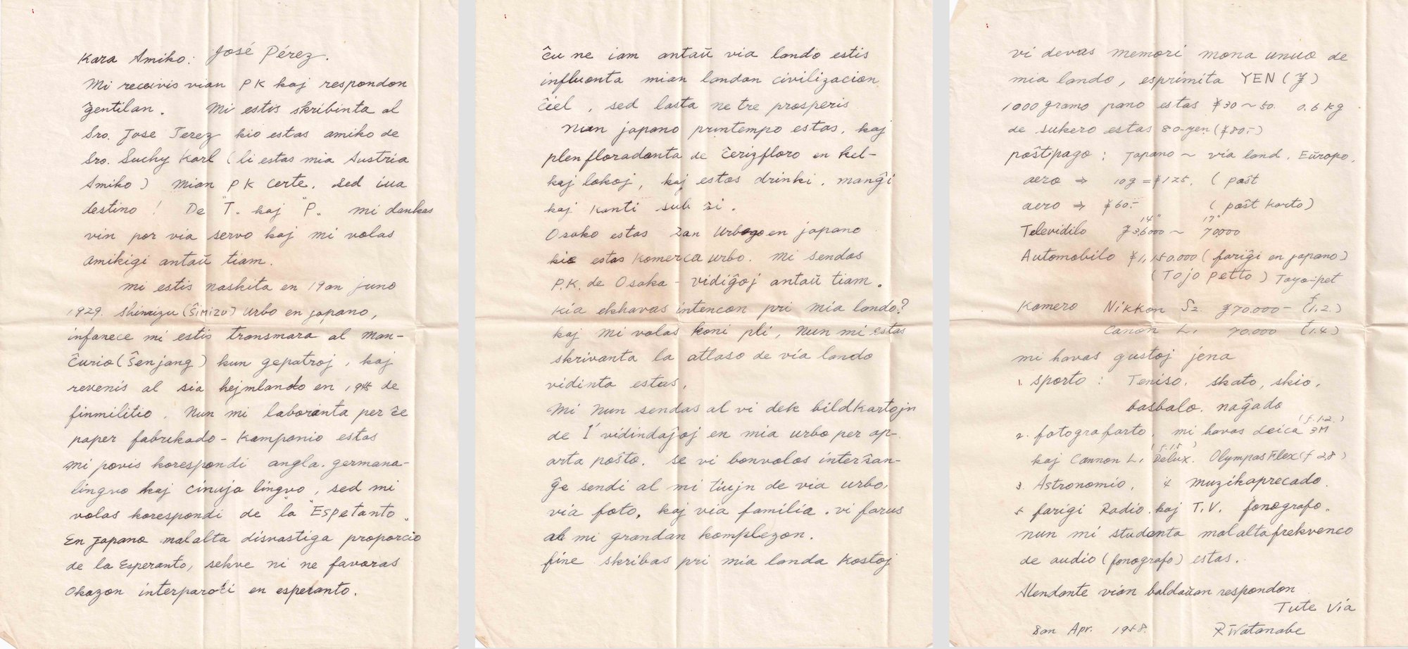 Navegando por la colección de Ana di con una carta escrita a Sempere en esperanto por un tal Kazuro Watanabe. No soy esperantista, pero japonofila lo soy un rato, también una enamorada de la gente con aficiones, así que decidí comprar la carta y algunas cosas más. Mientras esperaba a que llegara el paquete –y mientras Ana me decía que tenía más cosas en «esperpento»– investigué un poco acerca de Kazuro Watanabe, que resultó ser… un astrónomo amateur y un cazador de asteroides (llegados a este punto el corazón ya se me había salido del pecho).1 También es autor de tres libros con unos títulos que ojalá se me hubieran ocurrido a mí: Asteroid Hunter, Celestial Body Photography Manual y The Celestial Sky of Our Dreams. Cuando el paquete llegó y vi todo el material, pensé en hacer un fanzine y llegué a pedirle a Javier Guerrero,2 traductor de esperanto, que me tradujera la carta que Watanabe le envió a Sempere. Accedió con mucho gusto y dos horas después de mi primer correo, Javier me envió la traducción, y añadió: «Es un texto muy sencillo y un poco naíf. Mucha gente utilizaba el esperanto para tener eso que llamaban pen pals. El autor japonés no es nada fluido en esperanto, tiene un conocimiento muy básico y comete muchos errores». Se despidió en esperanto con un «brakumon», un ‘abrazo’.