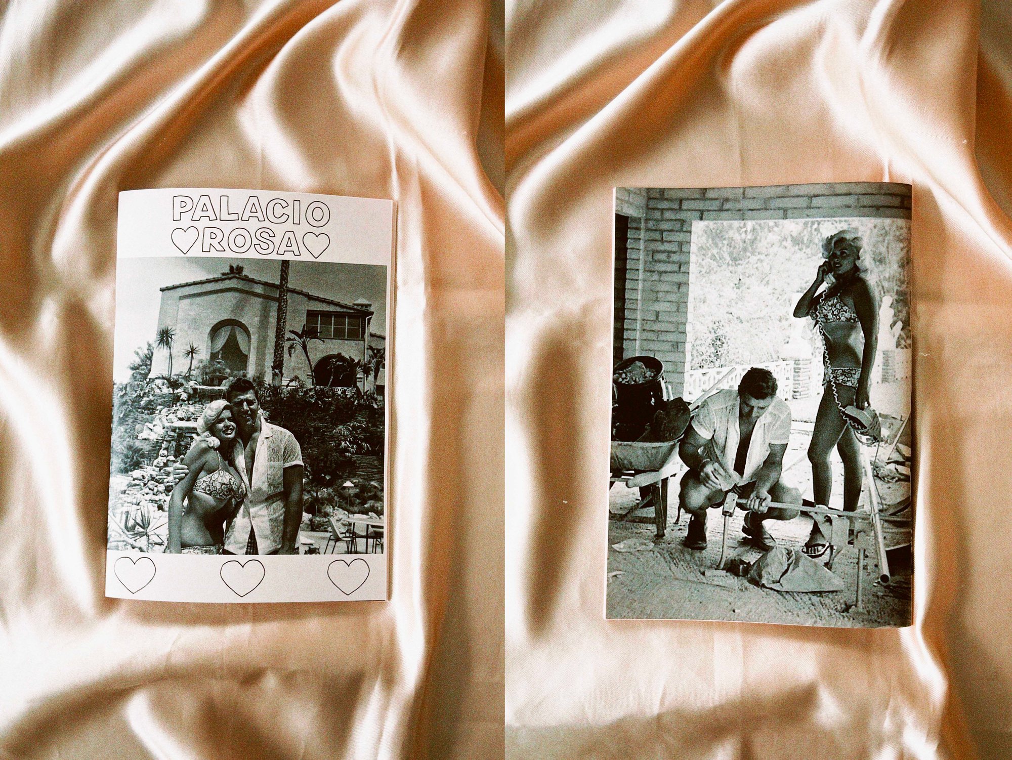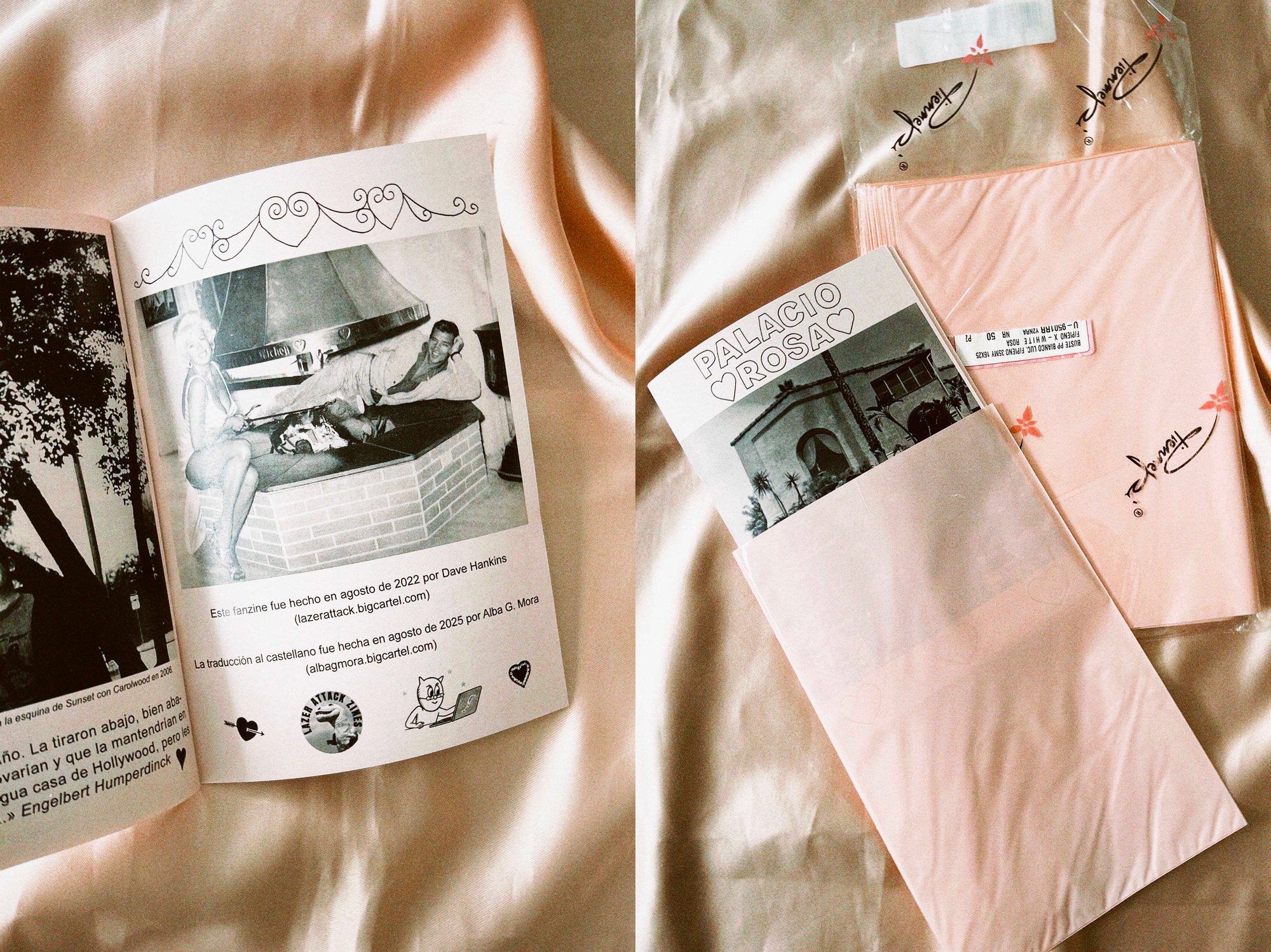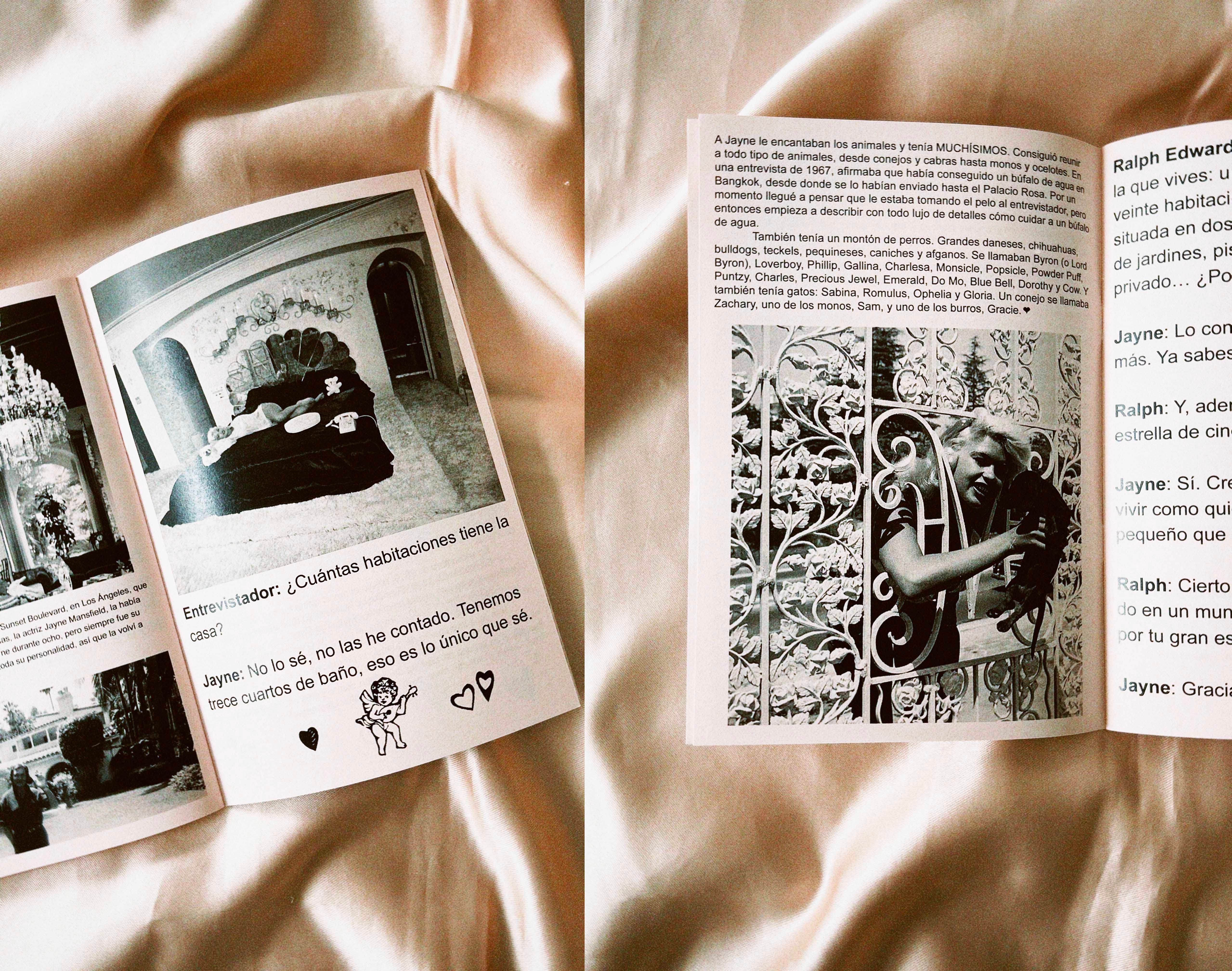 Con todo esto en mi mochila llena de otras tantas cosas, me fui a Nueva York en agosto y visité Quimby’s, una librería pequeñita pero hasta los topes de fanzines donde me gasté mi buen dinero. Entre los fanzines que compré ese día destacaba uno impreso en papel rosa que había comprado por impulso, sin haberlo abierto. Se titulaba Pink Palace y lo firmaba un tal Dave Hankins, del que también había pillado un fanzine llamado Gorilla Movies (ambos publicados en Lazer Attack, su sello de fanzines). Devoré ambos esa misma noche, pero Pink Palace me afectó de una forma especial porque en él, Dave hace un recorrido exhaustivo por la mansión que la actriz Jayne Mansfield y su marido Mickey Hargitay tenían en el 10100 de Sunset Boulevard de la misma forma que yo había recorrido mentalmente la de Liberace. La única, y gran diferencia, es que Dave se ha pasado 25 años investigando sobre la casa e incluso pudo visitarla en una ocasión y llevarse un pedacito de historia. La casa de Jayne, tan ostentosa como la de Liberace y con una piscina en forma de corazón, estaba llena de cupidos, corazones y animales de todo tipo (ocelotes, burros, monos, perros y gatos). Era una manifestación del amor que Jayne y Mickey sentían el uno por el otro, una carta de amor preciosa en forma de casa que Dave consiguió encapsular en un fanzine. Así que, emocionada como estaba, le escribí en cuanto llegué a Barcelona y le pregunté si le interesaría que tradujera e imprimiera en España su Pink Palace. Me respondió amabilísimo y en cinco minutos ya habíamos llegado a un acuerdo fanzinero. Los siguientes días, los últimos de mis vacaciones de verano, los pasé traduciendo y maquetando Palacio Rosa, uno de mis fanzines favoritos, porque me encantan las historias de amor y porque es un refugio ideal.