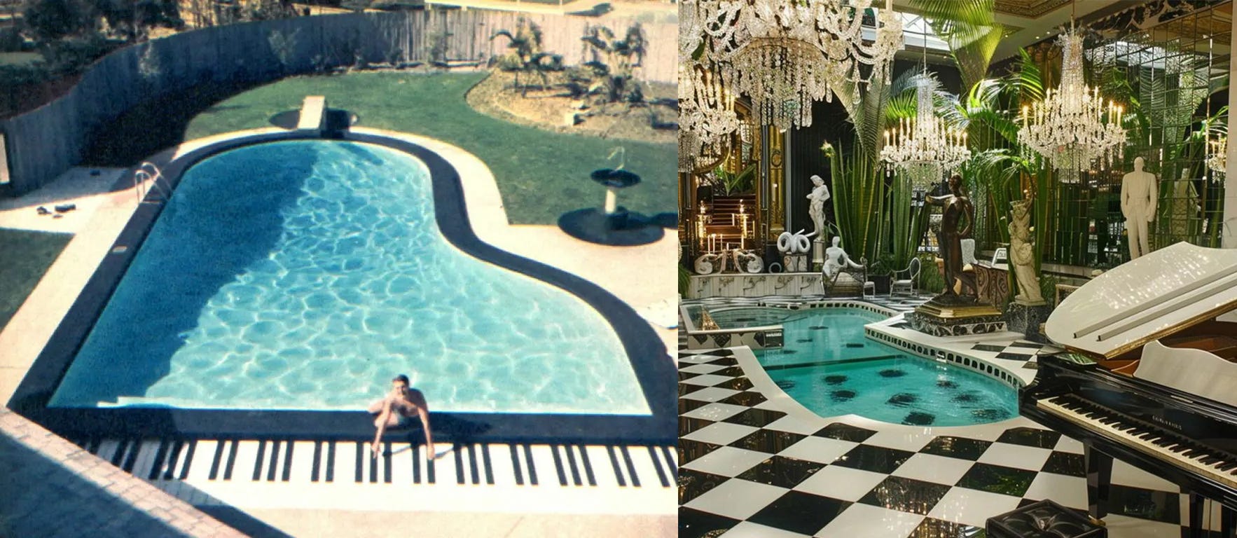 Pero algo pasó ese día porque desde entonces estoy obsesionada con encontrar sitios que me hagan sentir esa mezcla de ya he estado aquí+he soñado con esto sin haberlo visto antes+siento que lo conozco+parece que el tiempo está suspendido. Un ejemplo claro de esa sensación lo encontré tiempo después cuando vi la mansión que tenía el pianista Liberace en Las Vegas. Era una casa recargada, excesiva, con pianos carísimos y piscinas en forma de piano. Un sitio que era, en definitiva, como el propio Liberace.1 Y es a esa mansión a la que me escapaba (mentalmente) cuando estaba escribiendo la novela; quería trasladar todo lo que me despertaban los espacios así al papel y generar, en la medida de mis posibilidades, una sensación de extrañeza y de tiempo detenido.2