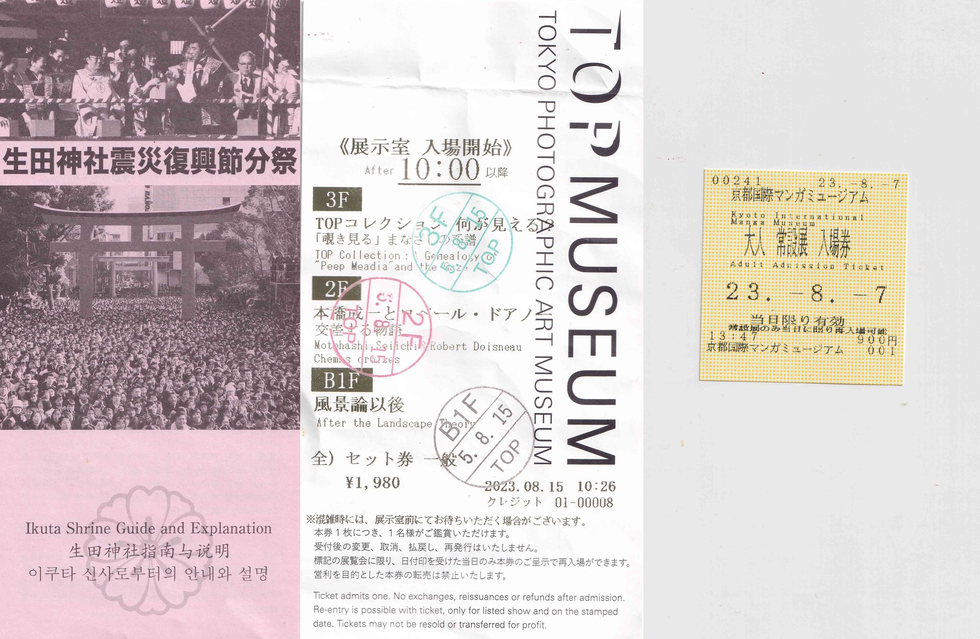 Una vez en Tokio, después en Kioto, me dediqué a hacer fotos, registrar sonidos y vídeos –el de arriba lo grabé con una Panasonic SDR-H40 que llevaba un tiempo utilizando y con la grabadora del móvil–, a llorar,1 beber café, a pasear con la boca abierta (eso lo hago en cualquier parte en realidad), a guardarme papelitos, servilletas, tickets y todo tipo de cosas que me iba encontrando. Disfruté muchísimo del bullicio ordenado, de las estampas de verano que creía que solo salían en las pelis, de la comida preparada de los 7-eleven, del silencio, del ruido, de la musiquita que hay en todas partes y de la educación generalizada. Experimenté lo que era no tener ansiedad en el transporte público, o pasear tranquila rodeada por el graznido de los cuervos, y sumimasen se convirtió en mi palabra favorita porque sirve un poco para todo y porque llevo el «perdón» por bandera. También investigué, mientras me comía unos pepinos encurtidos tumbada en un tatami de un ryokan muy barato, la forma de conseguir la nacionalidad japonesa. Estaba, está, complicado, así que volví a mi pisito de L’Hospitalet y me dediqué a volverme loca. Esparcí por el suelo todo lo que me traje, como en las pelis de detectives, para escanearlo, y olvidarme durante un rato de que vivía en el piso con los vecinos más ruidosos del mundo. Era algo que llevaba meses sufriendo, pero el contraste con el silencio que había experimentado durante mi estancia allí –algunos de los hoteles a los que fuimos estaban insonorizados–, me hizo darme cuenta de que tenía que tomar una decisión y de que no podía seguir viviendo en un sitio que me había llevado a sufrir alucinaciones auditivas (este episodio «depalmesco», si te parece, lo dejo para otra newsletter).2 Estaba claro que las vacaciones me habían salido caras en todos los sentidos. Por suerte, cinco meses después pude mudarme y, una vez más, mi madre, con sus frasecitas –que primero me sacan de quicio–, me ayudó a quitarle hierro al asunto: 1. «y qué hacemos, chica», 2. «todo no se puede tener», 3. «da gracias que has nacido aquí», 4. «Japón no se va a ir a ningún sitio».3 Así que empecé a ahorrar para la siguiente visita (de la que te hablaré en unas semanas si todo va bien y me apetece escribir).4 Ahora te dejo con la razón que me ha llevado a escribir esto, los souvenirs que me traje de mi primer viaje a Japón: