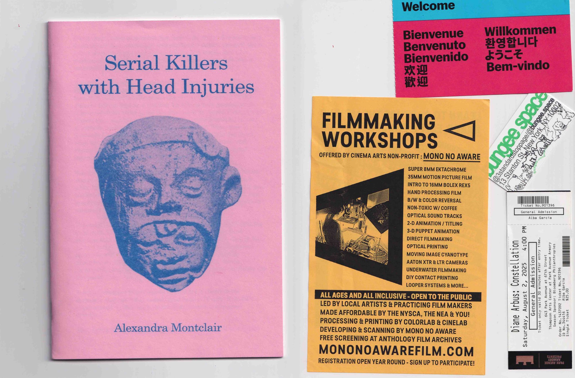 Es difícil ser una misma en una gran ciudad. O en un sitio que no conoces. Yo me siento pequeña y torpe, como si se me olvidaran todos los trucos de la gran ciudad que he aprendido hasta ahora. De repente, me da vergüenza entrar en una cafetería, pillar el bus o pedir la cuenta y me da la sensación de que las personas que se cruzan conmigo ven algo en mí que yo no soy capaz de ver.1 En Nueva York fue así todo el rato, en ningún momento tuve la sensación de que estaba en control porque nada te prepara para una ciudad como esa donde todos caminan con un rumbo claro y seguridad, hay pibes con cámaras de 16 mm –Jonas Mekas vive, la lucha sigue–, las chicas hablan de un tío llamado Trevor y los chicos de algo llamado «Front end Developer». Siempre evito generalizar, pero te prometo que escuché a varias chicas hablar de un tal Trevor, a lo mejor era el mismo Trevor, a lo mejor todos hablaban del mismo «Front end Developer» porque como termina pasando, ninguna ciudad es tan grande y todo el mundo comparte historia con la misma persona desgraciada. Por suerte, en el limbo que son las vacaciones hay otro limbo, que es el de la habitación de hotel, un espacio en el que te puedes quitar la máscara de susto y ser tu misma rodeada de las cosas que vas acumulando durante el viaje. Como ya conté en Souvenirs de Japón, a mí me gusta coleccionar cosas gratis –tickets, servilletas, papeles de todo tipo– y también intento pillar muñecos, fanzines y libros. En Nueva York, comprar un libro o un fanzine sale más barato que comprar mantequilla o un litro de zumo de naranja en el super, así que me hice con una colección bastante guay que paso a enseñarte, en parte, a continuación. Al final de todo, también te comparto un vídeo que grabé en uno de esos momentos de limbo dentro del limbo. Espero que encuentres alguna referencia interesante o inspiradora.
