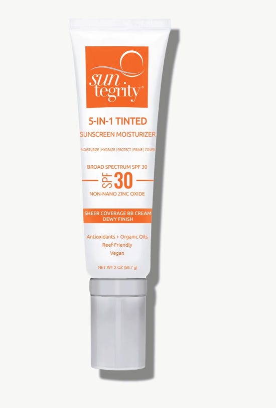 This lil’ sweetheart is the Suntegrity 5-in-1 Tinted Moisturizing Face Sunscreen. (But why isn’t it called “Skintegrity”!? Why!?!?)