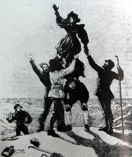 Cuando llegaron a la cumbre, Couttet y otro guía le dijeron a Henriette que le faltaba un paso más, subir a donde ninguna otra persona había estado antes. «¿Se puede ir a la luna desde aquí?», preguntó ella. Pero no se referían a eso. Los guías hicieron una especie de sillita de la reina con las manos, d’Angeville se subió a ella y la alzaron todo lo que pudieron.