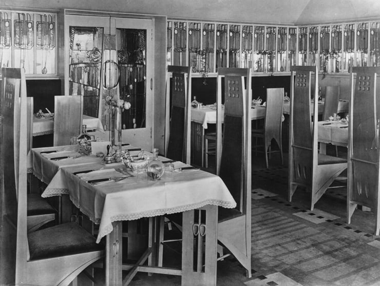 En 1878, con 29 años, montó la Crown Luncheon Room, su primera incursión en el mundo de la restauración. ¿En qué se diferenciaba de los locales de su hermano? Todas las fuentes que he consultado hablan de un gran énfasis en el diseño y la decoración, en la limpieza y en la calidad de lo que se ofrecía. Vaya, que no sabemos cómo eran los establecimientos de Stuart, pero con esa descripción preferimos ir a los de Catherine. En 1892 abrió su segundo salón y, aunque ya estaba casada, siguió construyendo su emporio bajo su nombre de soltera, Miss Cranston’s Tea Rooms. Los siguientes abrieron en 1897 y en 1903.
