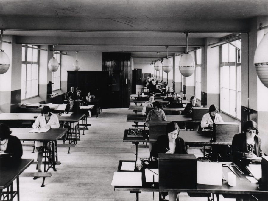 Pero ¿qué hay detrás de todo esto?, ¿cuál es la historia no oficial? Las salas de dibujo de Monotype, en las que se dibujaban y pulían y adaptaban para su fabricación todos los detalles de la tipografía que iba a ser producida, tenían este aspecto: