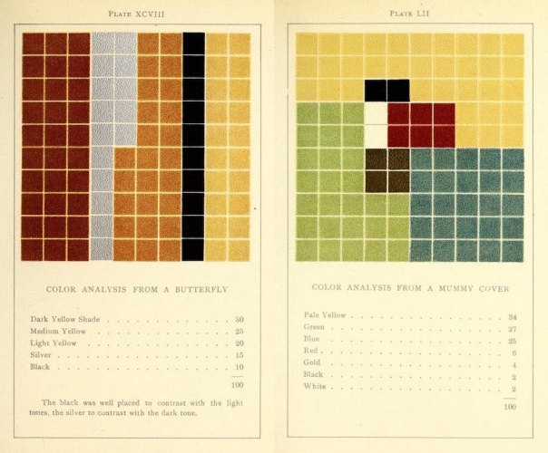 El libro son 400 páginas entre las que lo más llamativo son las láminas con cuadrículas formadas por cien cuadraditos de colores (10x10). Son, explica, análisis de los colores de distintos objetos: desde una tetera hasta la tela que envuelve a una momia (estamos en época top de la egiptología y Emily era, además, coleccionista de objetos exóticos). Su teoría es que analizando así cualquier cosa, desde una flor o un pájaro hasta, sí, momias, podemos aprender sobre armonía y combinación de colores. Explicaba que la clave siempre estaba en la naturaleza, donde todos los colores son perfectos («un gorrión muerto te permitiría organizar la marquetería del armario gabinete con una armonía impecable»), pero también en países lejanos, de ahí las láminas dedicadas a las momias y sus féretros o a azulejos asirios.