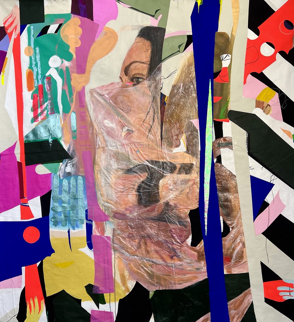 Acrylic, flashe, latex, polyurethane, cellophane, skin and latex and other stretchy things on linen 66 x 60 in