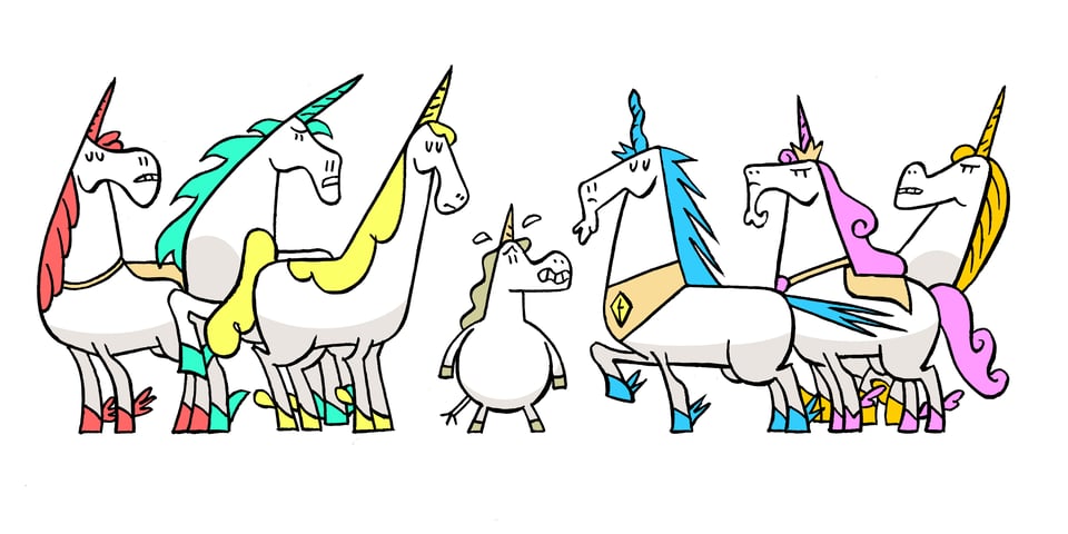 Contrasting the haughtiness and power of the mature unicorns with Punycorn's less imposing physical presence.