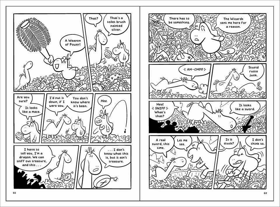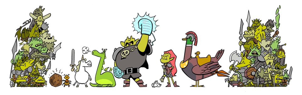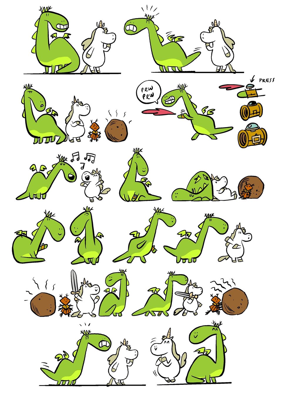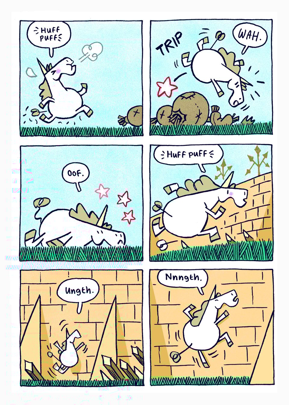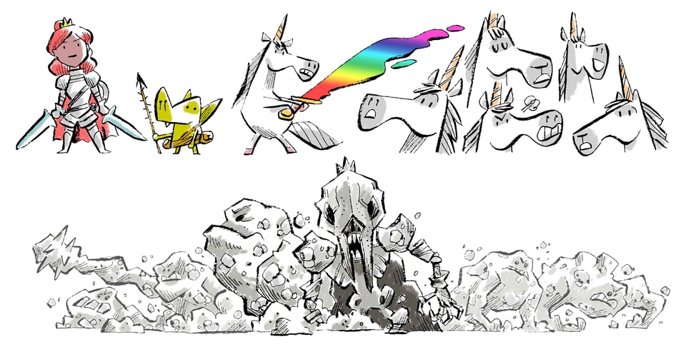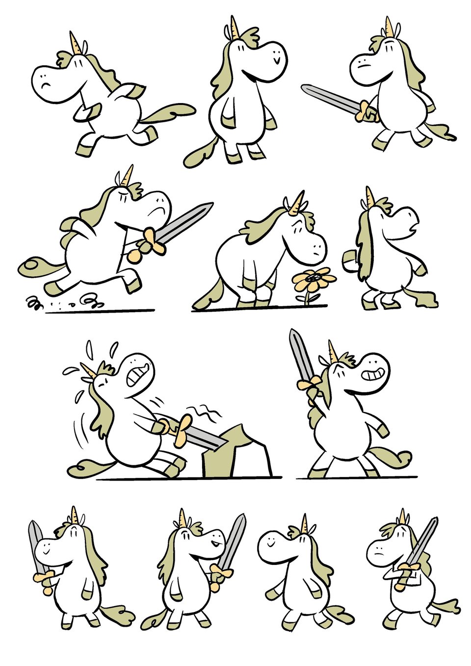 I finally settled on a design that I could work from while drawing the book. Round shapes make for a friendly huggable appearance. Perfect marshmallow, plushie material. Even while wielding a sword Punycorn is cute. I was happy enough with this to use it as my template for the finished pages.