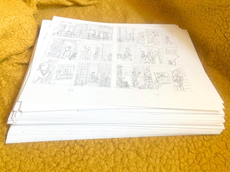 While my digital drawing is up to snuff, working on paper has taken a back seat. The solution is to dust off the thumbnails of the sister book to The Book Tour and figure out this pen on paper thing again. It's not easy, but the fear of facing the metaphorical rowing machine afresh is keeping me accountable.