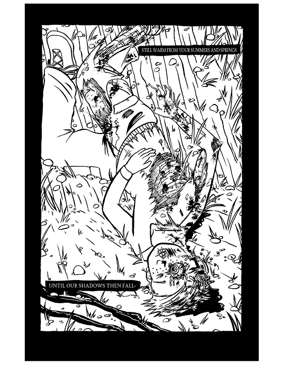 I was connected with the artist Steven Charles Rosia after asking around on Comics Twitter (the good ol’ days) and getting his name recommended to me. He was so kind and patient with a newbie like me. And he did a gorgeous job with the art. I love how dirty he made the natural space. I remember being in awe of his cover art. The comic released around springtime 2016.