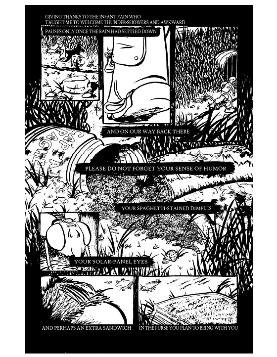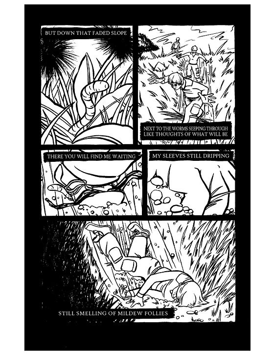 Oh, one more thing… The location of this comic is actually based in a real place, the ditch at the end of my grandparents’ road. I would spend countless hours there when I was a kid. And I would be completely absorbed by the natural world and trash around me. It felt almost otherworldly.