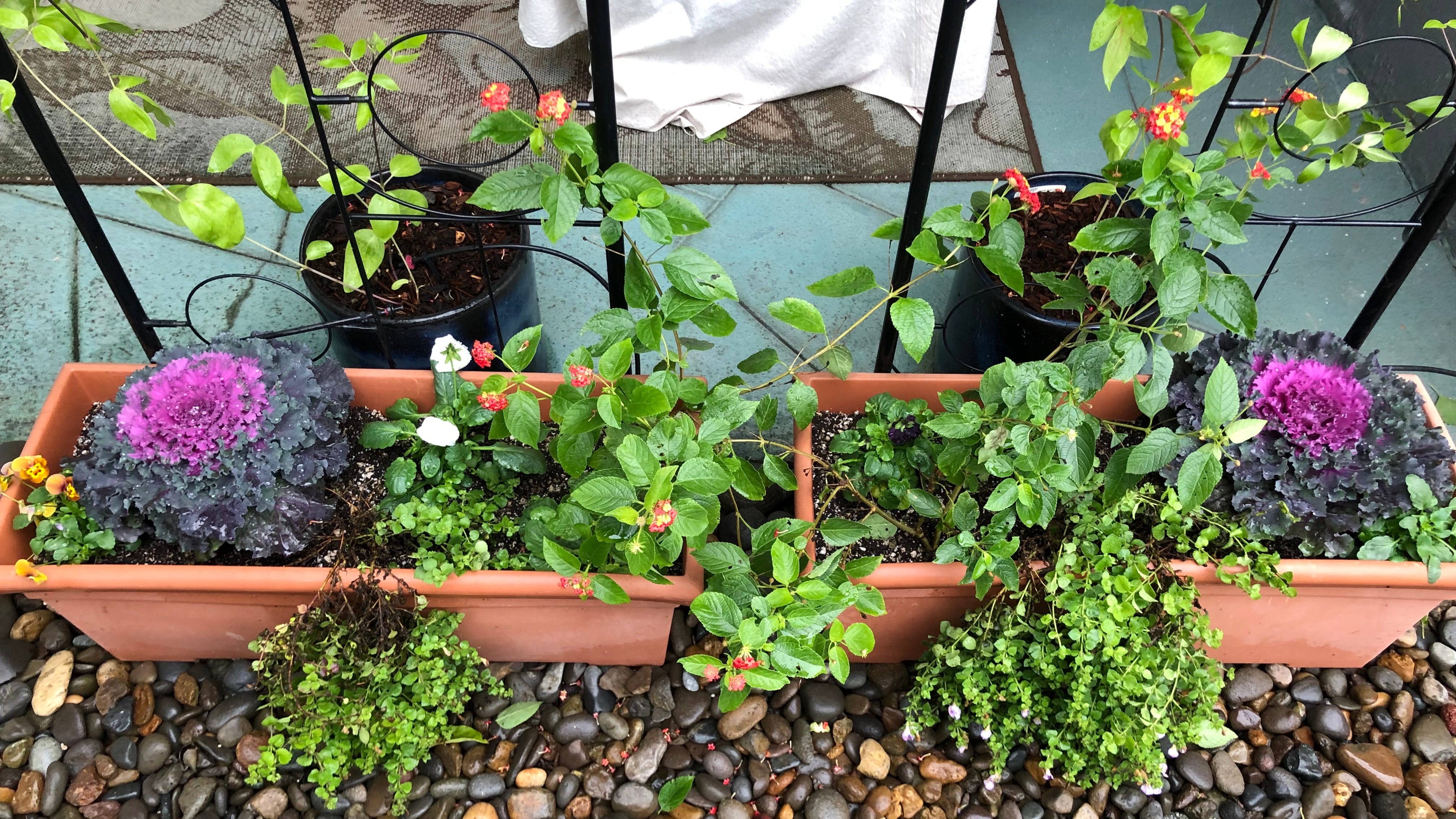 The lantana has very warm tones for bloom color so it jives less with the cooler colors of the pansies and violas than the bacopa, but this is just a test to see if they will even survive a winter here. Lantana comes in many colors so if the experiment is a success I might consider being more discerning when choosing colors for summer planting so that anything that stays will go better with a winter planting. Hard to tell at this point, but the pansies and violas in these are a mix of yellow, white, purple, and blue.