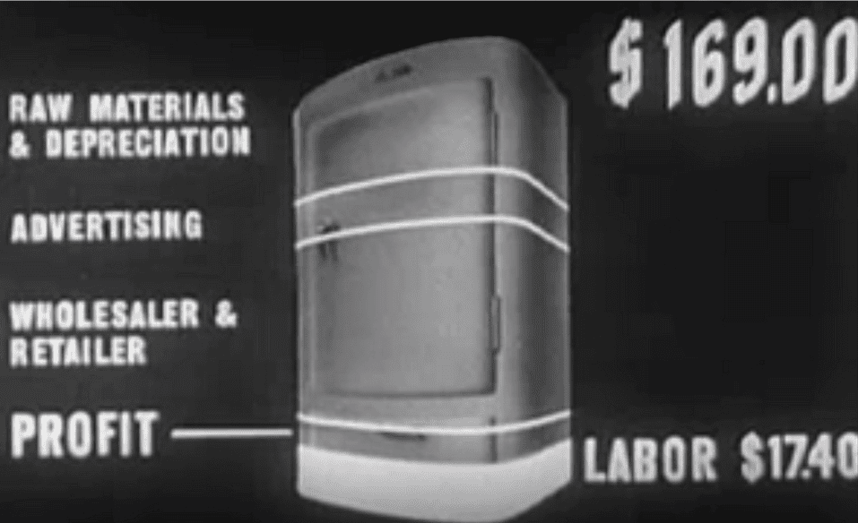 It breaks down a General Electric refrigerator visually into different costs. You can see labor is only around 15% of the cost, which is an excellent argument for a union demanding a wage increase. But let’s also point out how narrow the profit slice is in here. This is a pretty good profit margin, eyeballing it, but it’s not much– it’s less than labor’s share, and far less than every other cost as well.