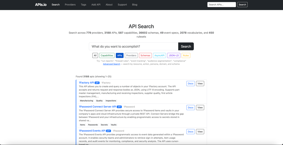 APis.io is a great name for a site, but I am not convinced API search is anything people care about anymore. However, with that said, I think there is a lot of context present across the APIs.io index, and with the latest enhancements to my API Evangelist profiling—this context has increased. I’ve added schema, both JSON Schema and JSON Structure, JSON-LD, as well as examples. I am working to get beyond just the API here, and understand what is needed to strike the deterministic balance required to integrate AI into the enterprise. Ultimately I do not think it is the APis.io search engine interface that will matter, and it will be the API behind, as well as the machine-readable artifacts indexed at APis.io that will matter, which when combined with the rating, pricing, rate limits, and other economic aspects of API Evangelist profiling—it all becomes pretty interesting.