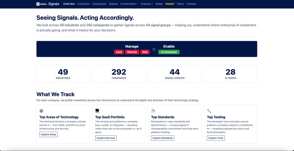 Next up, I have Naftiko Signals, where I’ve profiled the public signals for 292 enterprises, trying to understand how they have responded to artificial intelligence. I am expanding this 3X this quarter. There is a wealth of insights and context present in these signals. The list of services and open-source tooling that these companies have invested in is powering the prioritization engine in the API Evangelist crawler and profiler, which shapes the storytelling on API Evangelist, the indexes of APis.io, as well as the blog posts, podcasts, white papers, and other content I publish as part of Naftiko.io.