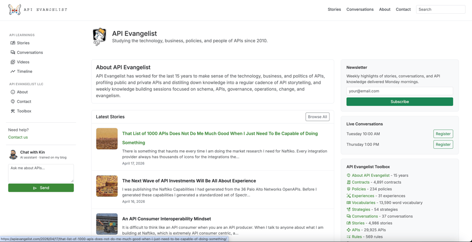 I am very happy with the current API Evangelist site. It showcases the stories from over the years, making them available via a search and chat. It also still has my toolbox for profiling all of the APIs I study. I’m current investing in refining and expanding how I profile APIs, replacing a lot of my deterministic scripting for artificial intelligence, with validation all along the way. Claude has gotten extremely good over the last two years when it comes to “artifacting”, and the APIs.json, OpenAPI, AsycAPI, JSON Schema, JSON-LD, Naftiko Capabilities, Spectral rules, and other artifacts in my API Evangelist toolbox are primarily AI generated these days, and JSON Schema and Spectral rule validated.