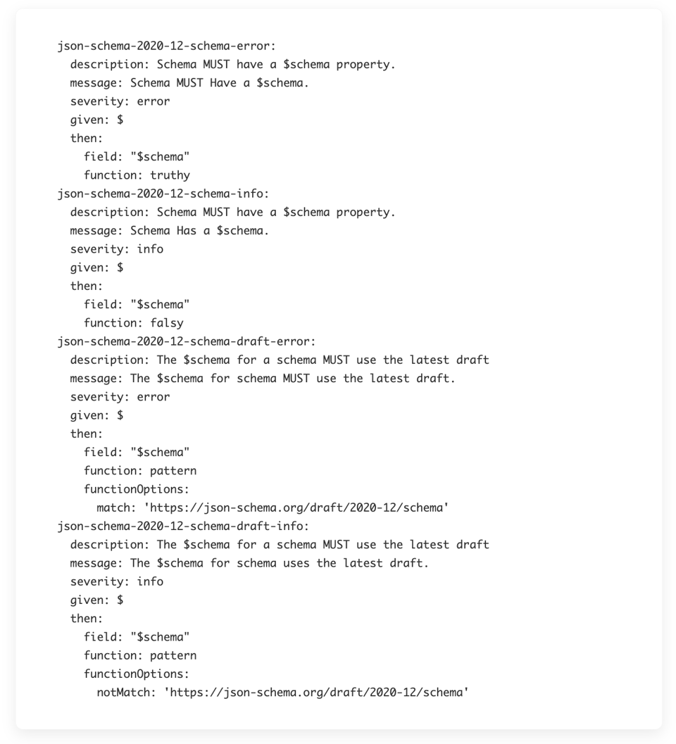 As I continue to develop my services for helping enterprise manage JSON Schema via Git repositories, I developed the first layer of fundamental Spectral rules for linting your JSON Schema artifacts. My goal with this work is to ensure that each schema has an id, the latest draft of JSON Schema, as well as the metadata needed to discover and understand what each schema is for. Not having your schema house in order is the biggest area of friction when it comes to implementing API governance at scale.