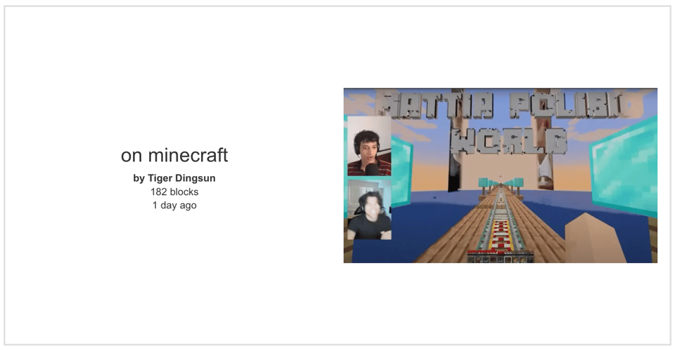 About halfway through, the video shifts in tone. They discover a path made of powered mine-cart rails — obviously player-made, but to someone unfamiliar with the game, believably a found object. They follow the path, and after a long ride it leads to a huge labyrinthine structure that Hamzah and Martin had built beforehand, filled with impressively specific details of Mattia’s life: old social media posts, a recreation of his childhood home, and vignettes like his birth and his first time playing soccer. They eventually reach a cavernous space filled with hundreds of copies of his house, each one representing a moment in his life. By the end of these shenanigans, Mattia is incapacitated with fits of incredulous laughter.