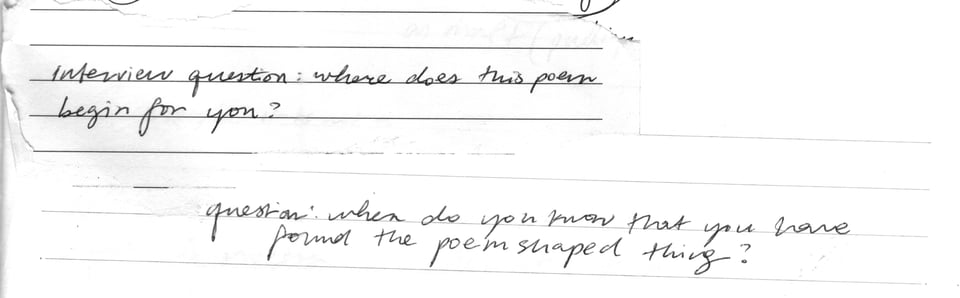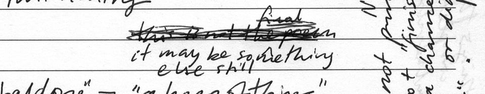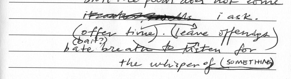 To be a living thing is also to be mortal, and in the document the life of the draft ceases. It is terrifying in its finality, in the ways it expects an actualization of my best, my finest. It looms. It reads like an obituary, the summary of a life. The document can often obscure or mystify its process. It is a product, an outcome, and is thus often centered as the main consideration in the work of writing. This orientation towards product over process diminishes the work of the draft, and refuses to consider the draft as a meaningful form of writing in and of itself. This consideration of meaningfulness is easier with the drafts, notes, journals of writers that we think of as accomplished. We give their pre-documents the weightiness of worth, honor them in exhibitions, and call these objects artifacts. Because their pre-documents give us insight into their process, they make their genius human. Perhaps we believe that somewhere in their drafts, we will find remedy for the ache or resistance of our own work.