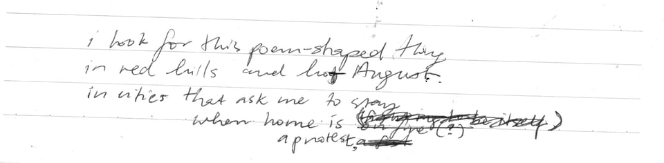 Drafts move and grow. The particular magic of a draft is that it is incomplete — and thus, not static. By mere function, the draft always extends and expands and changes form, or, at the very least, holds the promise of this. There is always the chance of more — of alteration and adjustment and addition and repositioning and removal. In my own poetry writing practice, this happens through strikethroughs, through arrows pointing between lines, words, or across pages, through subscripts and notes in the margins. They feel like visual compositions of their own, preserving and documenting the puzzling-together process of the draft. You have the pieces there in front of you — a first line, a particular image or metaphor, a structural idea — but you don’t yet know what the poem will be, what it will become. You move the pieces around, figure out how the lines fit together, try out different words until you find the one that holds the nuance you need.