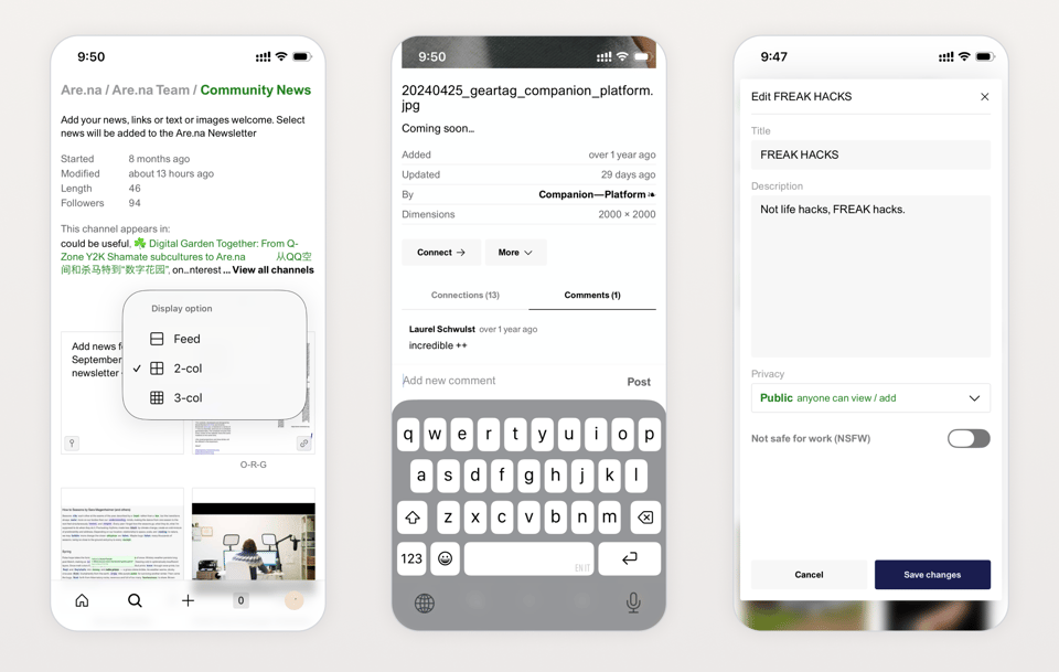 We’re continuing to roll out updates for the iOS app, and those on the Premium Supporter tier are continuing to enjoy them. If you can’t tell, we’re really really excited about the new app. It has changed our use of Are.na on the phone (for the better) — it’s nice to be able to look up channels quickly, add to them, and spend quality time with the things that we’ve saved.