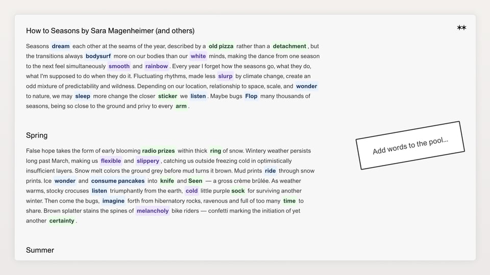 The project lives on pool-of-words.are.na and functions essentially like a Mad Libs. Sara wrote questions to solicit verbs, nouns and adjectives — once you answer these, they will fill in the blanks in her beautifully sensorial and absurd story “How to Seasons.” Your answers will also auto-populate a series of channels on Are.na. Next month, Sara will choose from the words in these channels to complete a final version of the text, which will run (credited) in the Are.na Annual, out in December.
