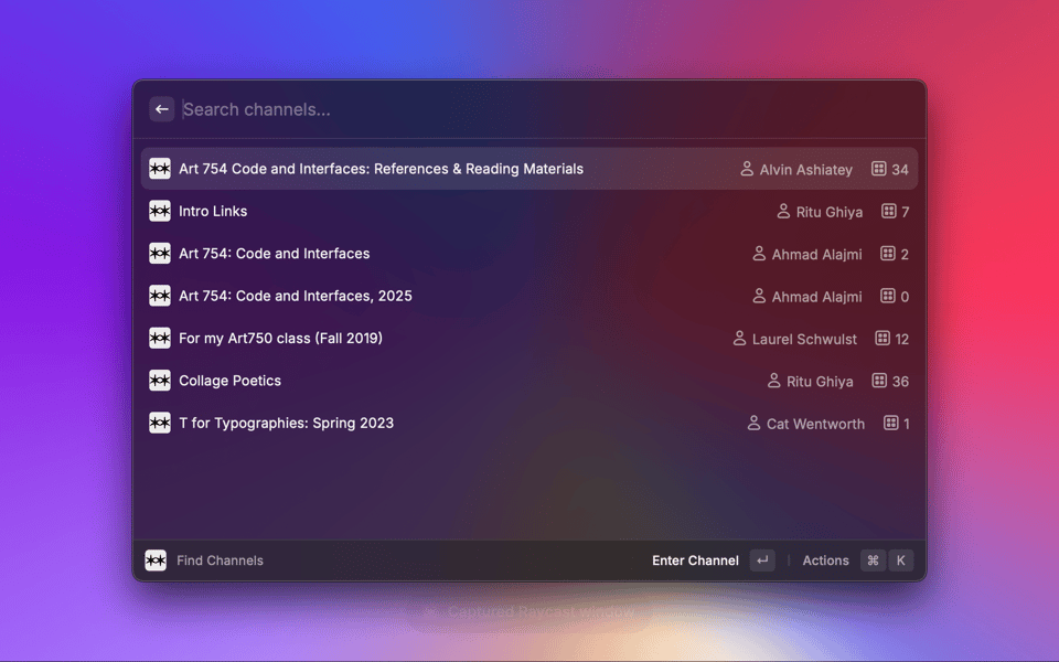 Lastly, Alvin Ashiatey made a full-featured Raycast extension for Are.na. For those who don’t know, Raycast is an application launcher and productivity tool. Alvin’s extension not only makes it possible to search Are.na from within Raycast, but also lets you create new channels and blocks as well.