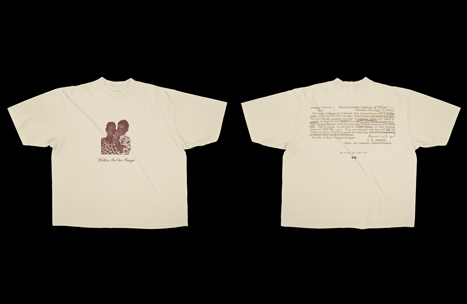 Now in the Gift Shop, we have two limited-edition T-shirts produced by Blacks of Are.na in honor of Juneteenth. The group (which you can read more about below) worked with Houston-based artist Mitchell Reece on two limited edition shirts, one standard shirt (Written in Our Image) and a premium version (Written in Our Imagination), both of which explore the power of information—what happens when it's withheld, and what becomes possible when it's reclaimed.