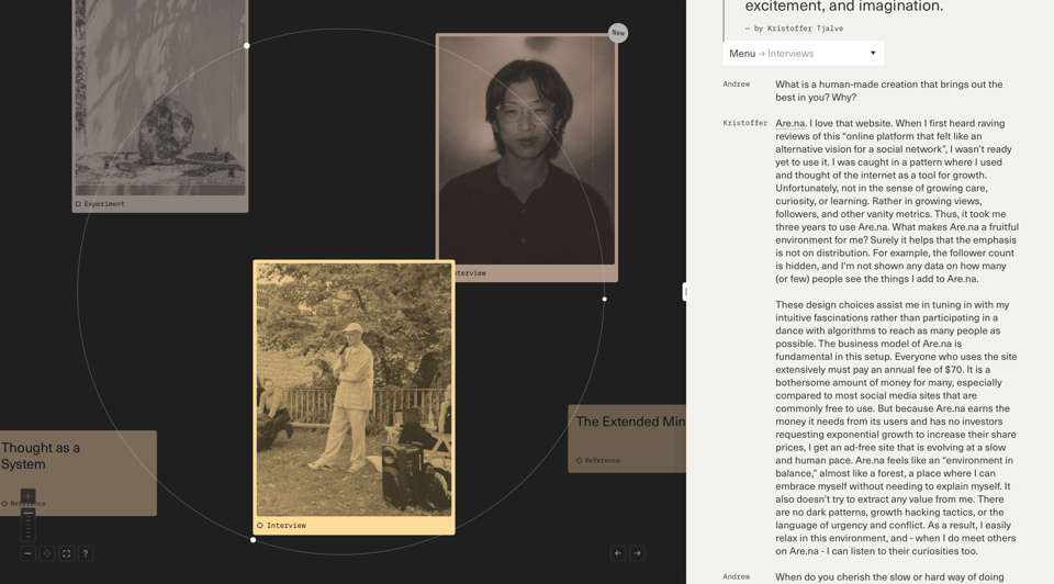 Thanks to Kristoffer Tjalve who mentioned Are.na in an interview for Apossible. He says, “Are.na feels like an ‘environment in balance,’ almost like a forest, a place where I can embrace myself without needing to explain myself. It also doesn’t try to extract any value from me. There are no dark patterns, growth hacking tactics, or the language of urgency and conflict. As a result, I easily relax in this environment, and — when I do meet others on Are.na — I can listen to their curiosities too.”