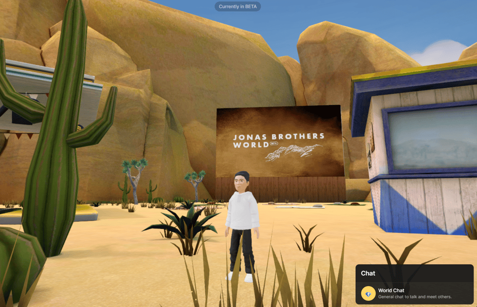 You arrive in an unincorporated desert community as the Jonas Brothers’ conception of what the default human being looks like. And wears. You cannot change your appearance or outfit without actually joining The World, and you cannot minimize the chat window any more than that.
