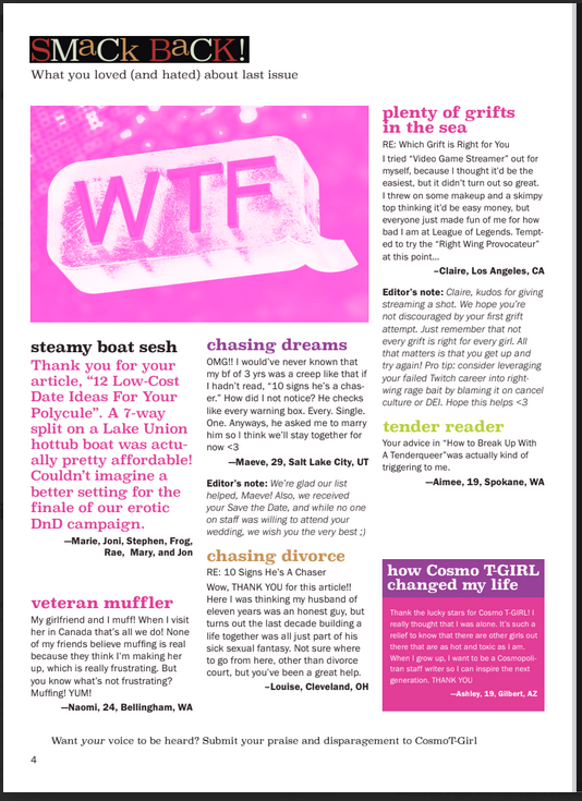 Recently, I have been cooking up a new zine project with a few friends, and that collaborative project has renewed me. It’s called Cosmopolitran, and it is what it sounds like: a magazine full of joke articles, quizzes, and advice. Look for it to be released in the next couple months. I plan to host a release party, and I hope you will come out for that. Check out this sneak peak: