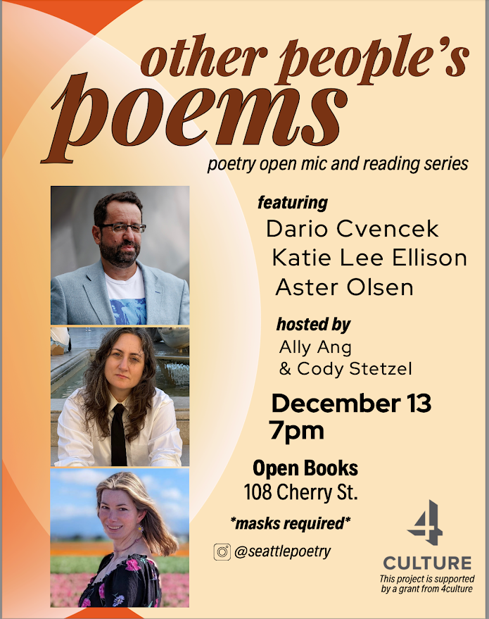 I’ll be guest reading along with Katie Lee Ellison and Dario Cvencek as part of Other People’s Poems December 13th. I don’t read a lot of poetry, so it’s been a fun exercise to expand and explore as I prepare, to see what I connect with and want to share. I hope you can make it out.