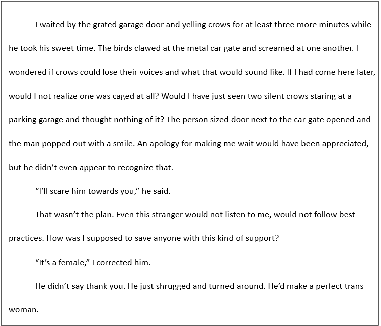 I have a story that will be published by Unlikely Stories in December. It’s called A Crow for Brunch, and is about a problematic trans woman who is trying to save a crow and generally crashing out. It’s the most explicitly trans story I’ve published, and explores the self destructive and isolating desire for acceptance.