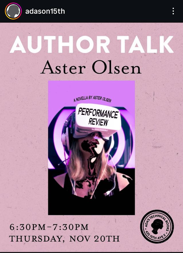 I’ll be talking with my friend Max West about my novella Performance Review (link to free pdf, link to purchase a physical print) and my work in general this Thursday November 20th at Ada’s. It’s the first time I’ve been in the hot seat instead of the interviewer, and I’m both excited and anxious. I’d love for you to come check it out.