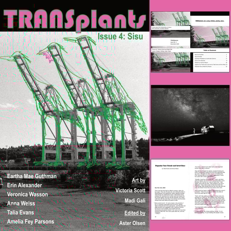 TRANSplants Issue 4 is releasing in December! Pre-order the zine here! I’m so excited to get this issue out. This one is focused around the theme of sisu. Sisu is a Finnish word which has no exact translation in English, but means unflinching determination in the face of overwhelming adversity. The writing in issue four is about visceral persistence, personal struggle, bravery, setback, undaunted determination, of getting bloodied and knocked down and forcing yourself to stand back up anyway. It’s about incomplete victory earned through pain and love, and about how some of us have won recently despite the propaganda that wants us to believe we are destined to lose. It’s about living our lives and fighting for a better world that we might never see, but fighting anyway, because the alternative is spiritual death and an empty life in the service of a system that despises us.