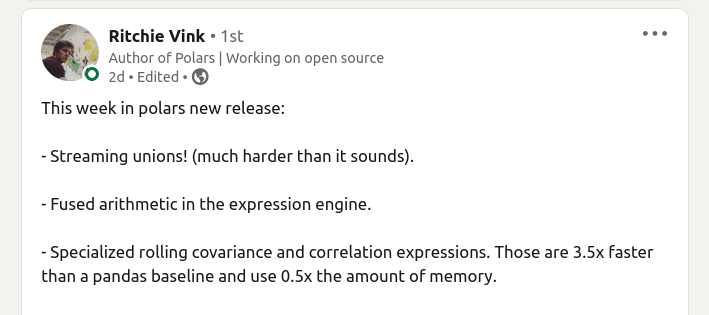 Y como cada primer noticiero de mes, novedades sobre Polars: entre las versiones 0.17.0 y 0.17.12 ha habido unos cuantos nombres de parámetros cambiados, soporte para crear un DataFrame desde un modelo de Pydantic, y muchas mejoras de rendimiento. ¡Esto va a toda velocidad!