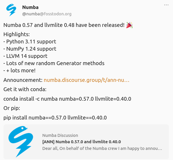 🚀 Tenemos numba 0.57 (y llvmlite 0.48) con esperadísimo soporte para Python 3.11, soporte para cadenas dinámicas en excepciones, mejor soporte para aritmética de media precisión en CUDA, ¡y mucho más!