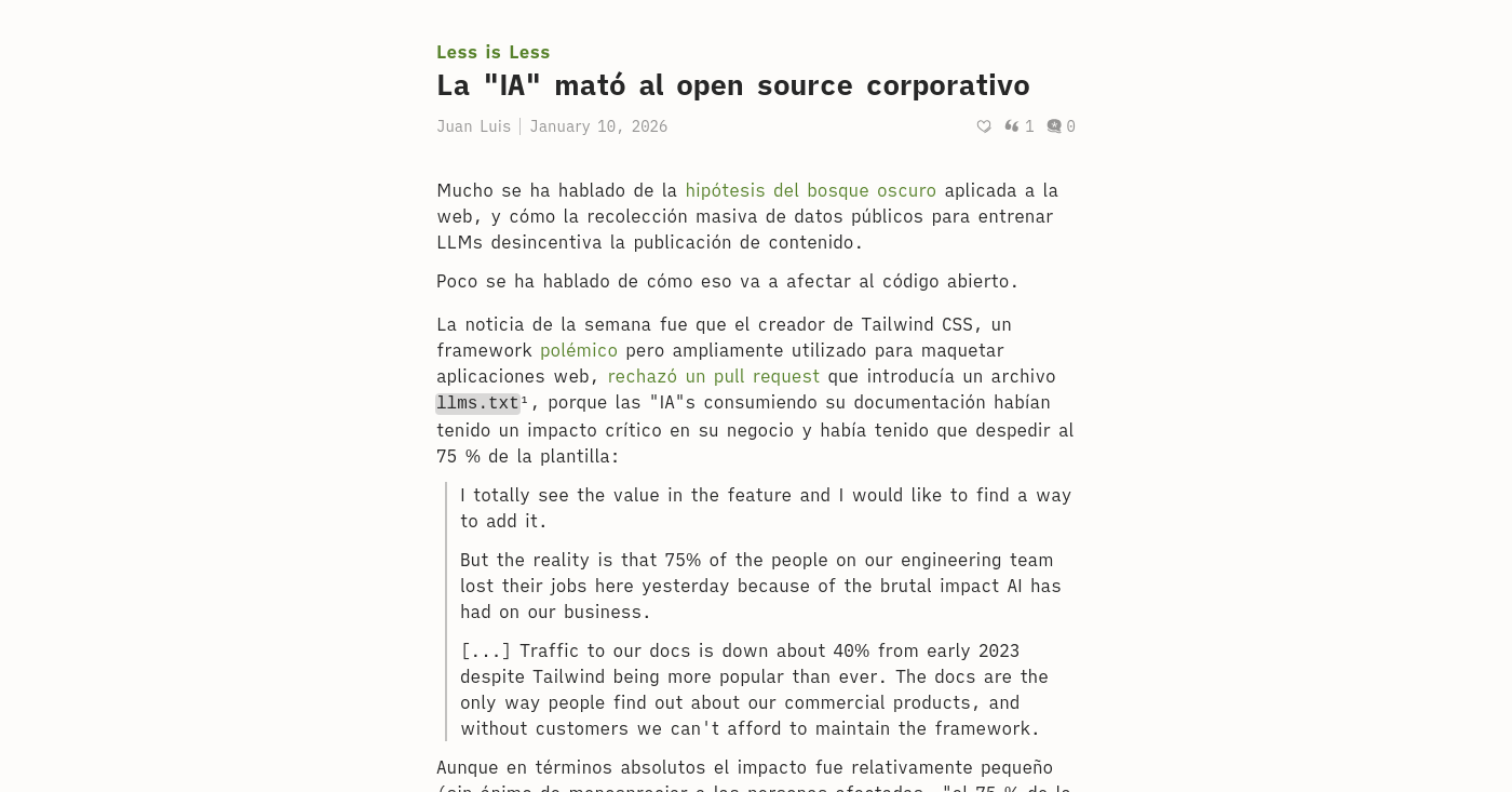 Así que aprovecho que me diste tu correo hace tiempo para contarte que puedes leer mi último texto, titulado “La IA mató al open source corporativo”, en mi nuevo blog: