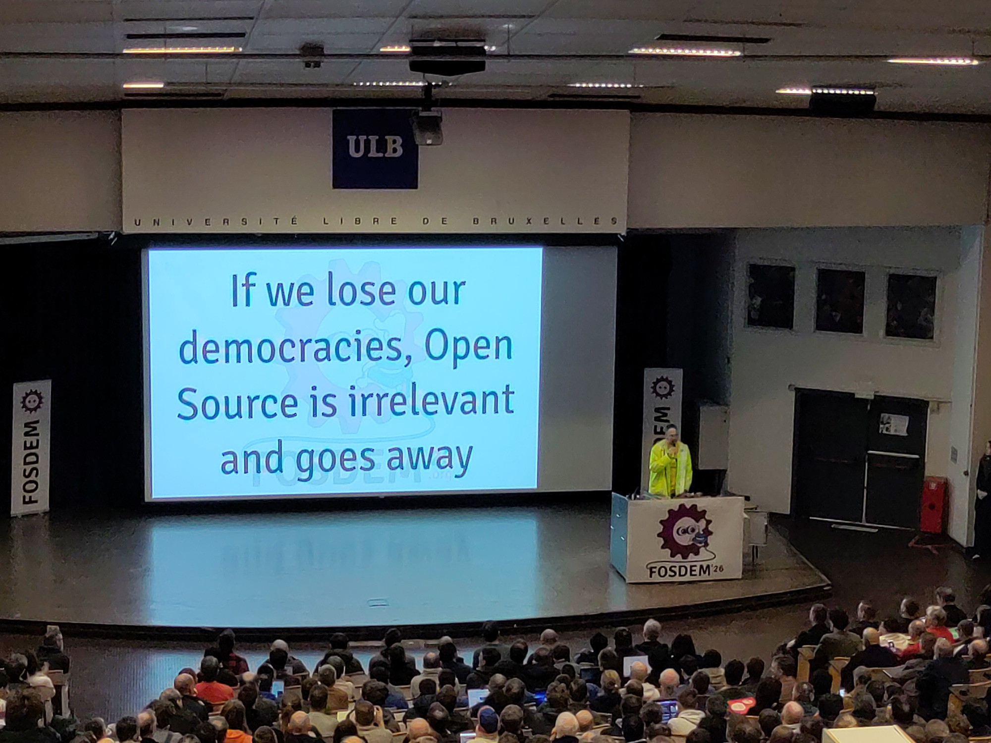 Nunca había venido al FOSDEM, a pesar de que mucha gente me animó a lo largo de los años. Por eso, cuando Richard "RichiH" Hartmann pronunció estas palabras durante la apertura del FOSDEM 2026, pensé dos cosas: (a) este es mi evento y (b) qué rabia no haberlo descubierto antes.