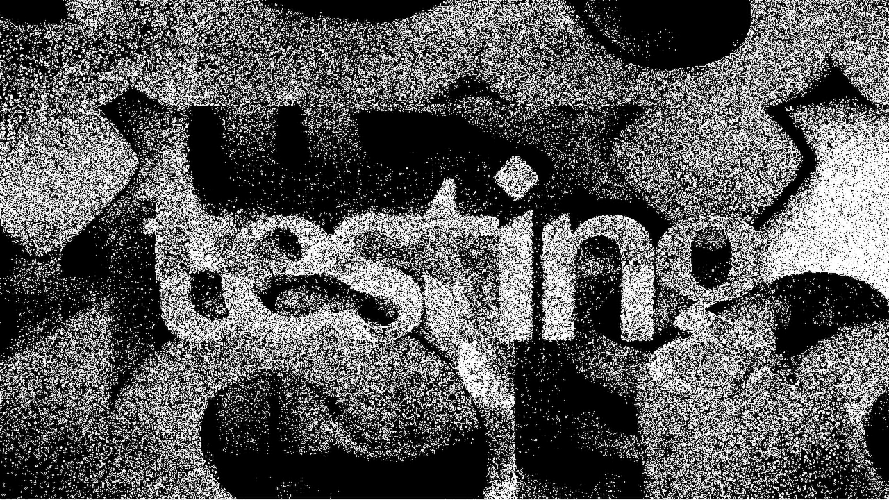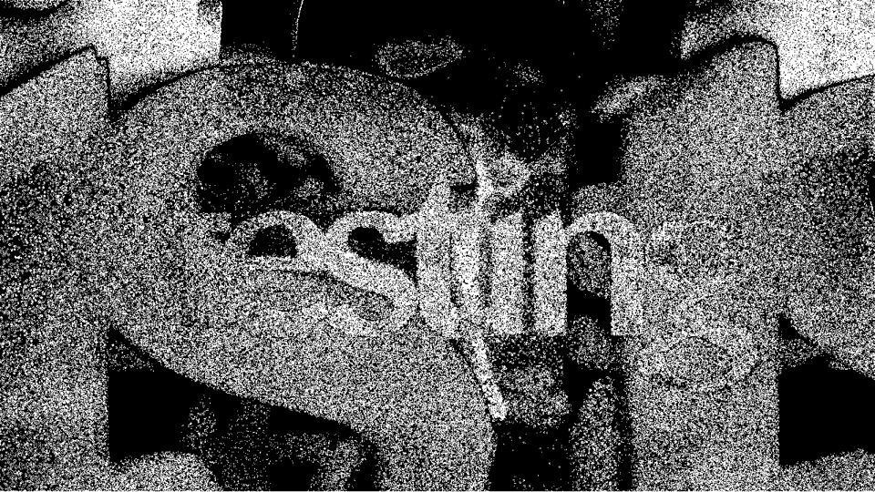 ID: A black and white digital image of grainy, overlapping text. Contrast between layers of text and the black background make some words appear as if they are melting into one another. END ID.