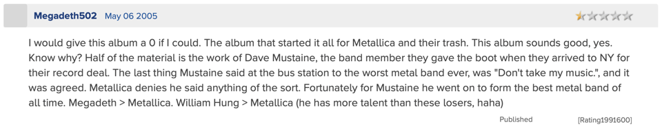So that was “Kill ‘Em All”, Metallica’s Kool-Aid-Man-style entrance into the metal scene. I absolutely adore this album despite its many flaws. It’s raw, it’s genius, it’s “metal up your ass”, and it’s the perfect musical representation of that young metal-head spirit that Metallica has sought to keep all these years. What makes it so different from their current records? Well this time it was authentic. However, I do understand if this album reads as “just a wall of noise” to you. There are loads of Metallica haters as well as Metallica fans that agree. Here’s a review I read on Rate Your Music today: