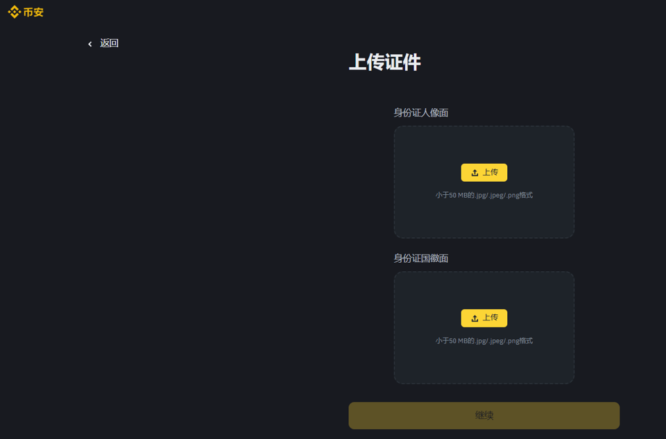 登录币安后,点击右上角的“去验证”按钮,进入身份认证页面。
