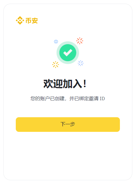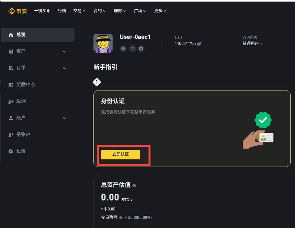 至此,你的币安账户初步已成功注册,但还要身份认证才可以使用币安功能并交易。