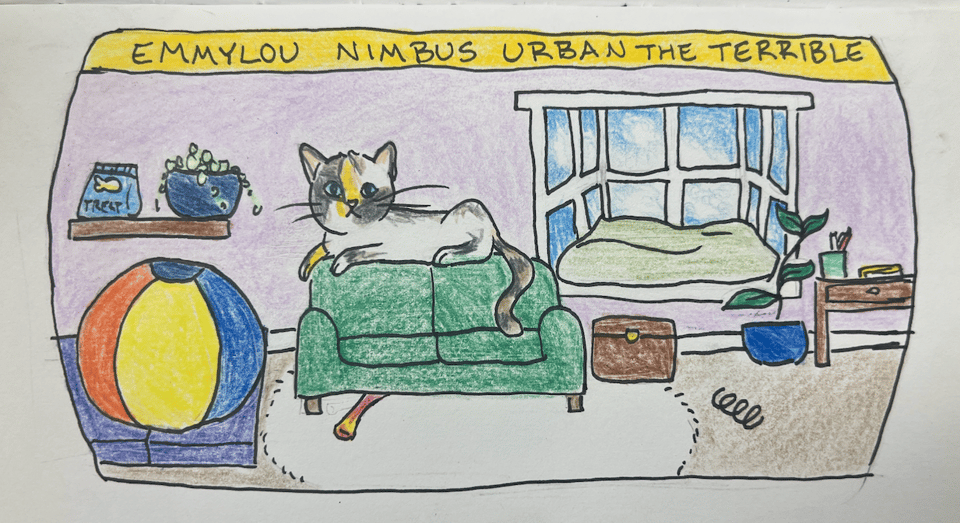 Emmylou Nimbus Urban the Terrible, my darling cat, is not lucky enough to have a digital doppelganger with an apartment for me to decorate, but I love to imagine what it might look like. First, she would need a large bay window. One that opens, so she can feel the breeze on her face while she studies her surroundings. Ideally, overlooking somewhere bustling, full of interesting people, sounds, and events. She has bright, inquisitive eyes. Some cats seem to have nothing behind their eyes, but Emmylou is fully present and thinking. She would need a cute notebook and pens to record any discoveries from her surveillance. One of the many stories we tell about Emmylou is that she goes to circus school, on account of her many acrobatic feats, so naturally she would need a large balance ball and mat to practice her many tricks with. A large container of treats nearby, for motivation and rewards as she trains. The walls of her apartment would be a soft lavender with white trim, there’d be a cozy green couch for her to curl up on, and the center of the room would have a plush carpet where she can get plenty of traction to run, play, and hunt her toys without skittering on a hard floor. As for accents, there would be lots of bells and plants. One of Emmy’s main hobbies is pretending to be a jungle cat in the garden plants, hunting for tasty bugs that might be eating the leaves. Finally, in the corner, a toy box filled with springs and fingertraps, her favorite toys.