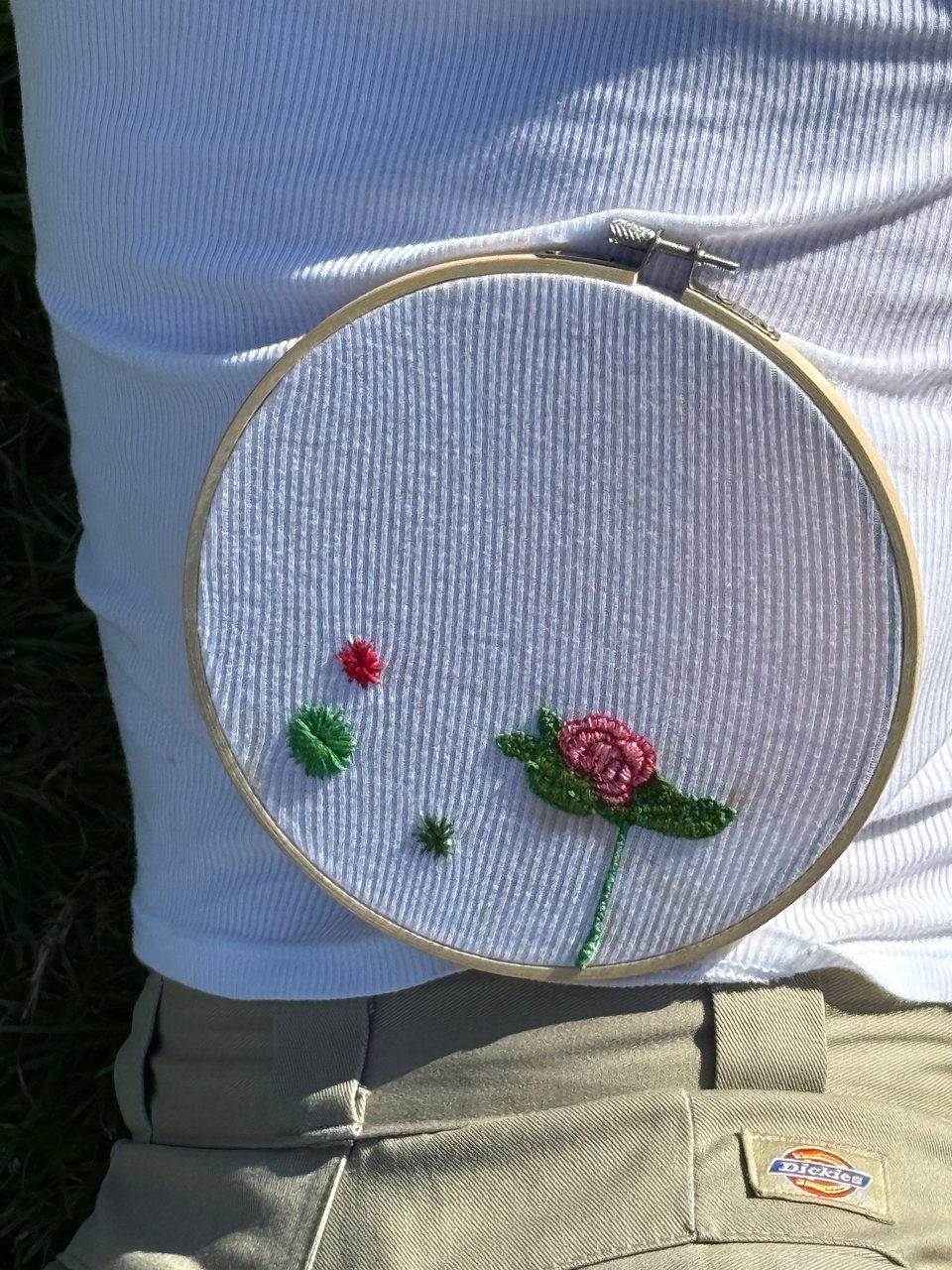 I walk home a little before midnight. I stop myself from turning on the lights because I do not want to see the poems, or maybe because I do not want the poems to see me. I promise myself that tomorrow I will take everything off the walls, that I will make a real effort to trust the men in my life, that I will stop making decisions out of fear. I decide to watch one more episode of Yanxi Palace before bed. Somewhere, on a sound stage in the People’s Republic of China, the Qianlong Emperor is threatening to have the palace embroiderer decapitated. I take off my tank top, still stained with pollen. I run my fingers over the stain while the palace eunuchs interrogate the embroiderer. Isn’t she going to beg the emperor for mercy? I take out my own embroidery box, and fit a hoop over the tank top. The embroiderer is on her knees but she refuses to beg. She reasons with the emperor. She remonstrates. I select some green floss, splitting it down the middle three times until I have equal lengths of thread. I fit the first length of thread through the eye of a needle, knotting the end. I push the needle through the center of the stain. For a moment, I hesitate, and then I start embroidering a lilypad.