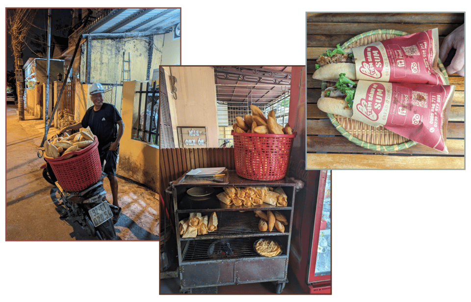 Hoi An has a lot of storied, greatly hyped banh mi shops (think: 10,000 Google reviews and Anthony Bourdain ate there once) but our favorite spot was little lower key. Also mentioned on many of the “best banh mis in the city” lists, Banh Mi Sum was a glass-fronted cart in front of a narrow room with wooden tables and chairs. Their bread arrived near-constantly in open-sided plastic laundry baskets, from which it was shoved into an open wood oven to warm. The bread was always hot and toasty, the fillings were perfect, and they sold a mint and pineapple juice that transported me to another dimension. 10/10.